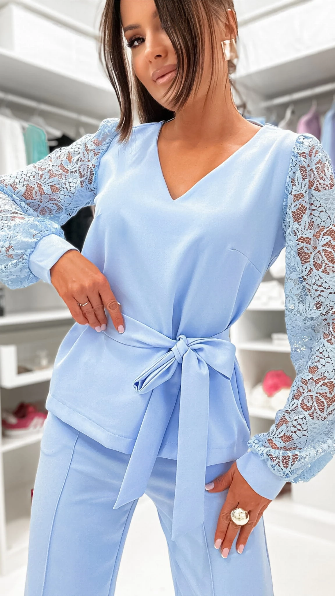 Zestaw składa się z lekkiej, luźniejszej bluzki oraz spodni z szeroką nogawką, które pięknie układają się na sylwetce i zapewniają komfort noszenia. Koronkowe rękawy dodają całości subtelności i elegancji, a dekolt V optycznie wysmukla sylwetkę i podkreśla kobiece kształty. Dołączony pasek pozwala zaznaczyć talię i nadać stylizacji bardziej dopracowany charakter.