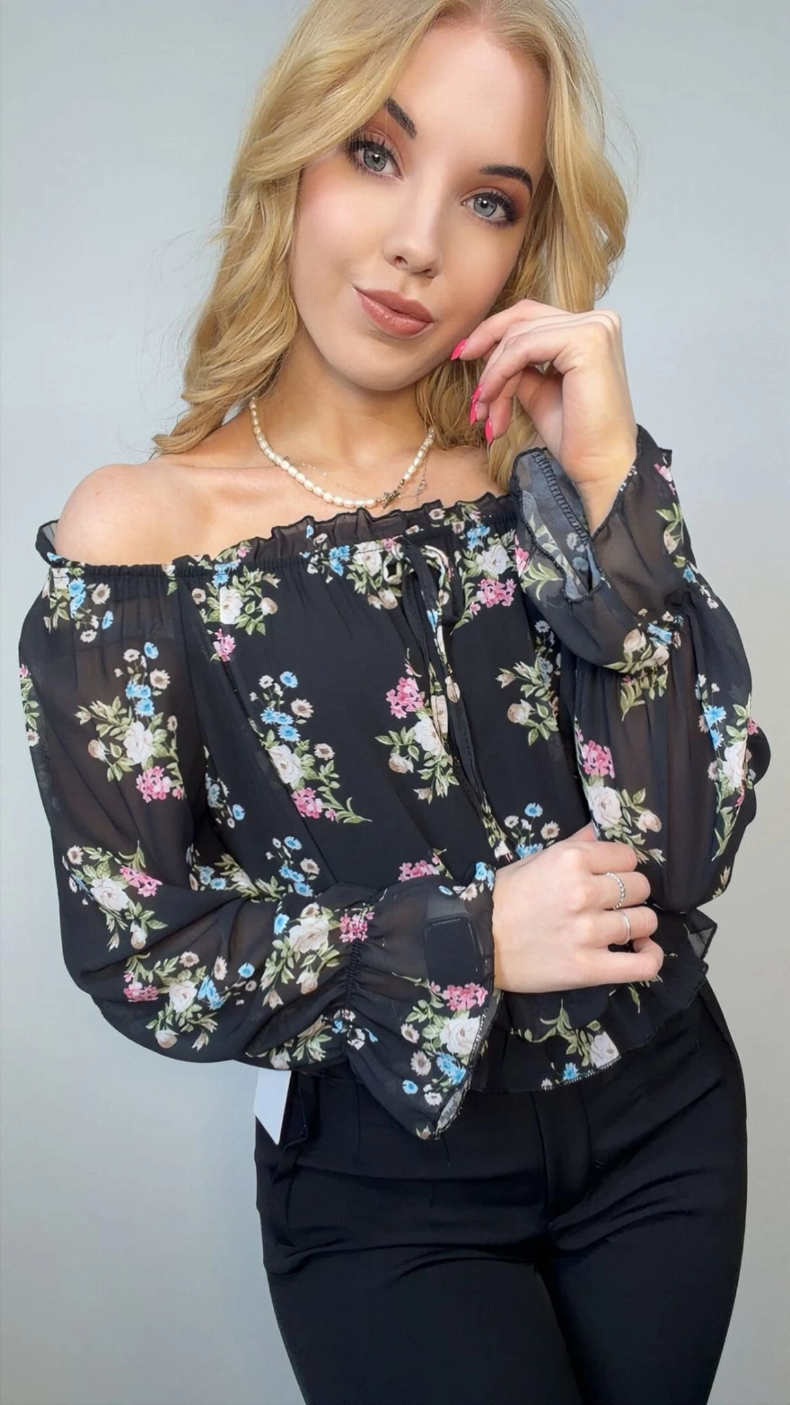 Kwiatowy wzór na czarnym tle sprawia, że bluzka prezentuje się bardzo elegancko i świetnie pasuje zarówno do spodni materiałowych, jeansów, jak i spódnic.