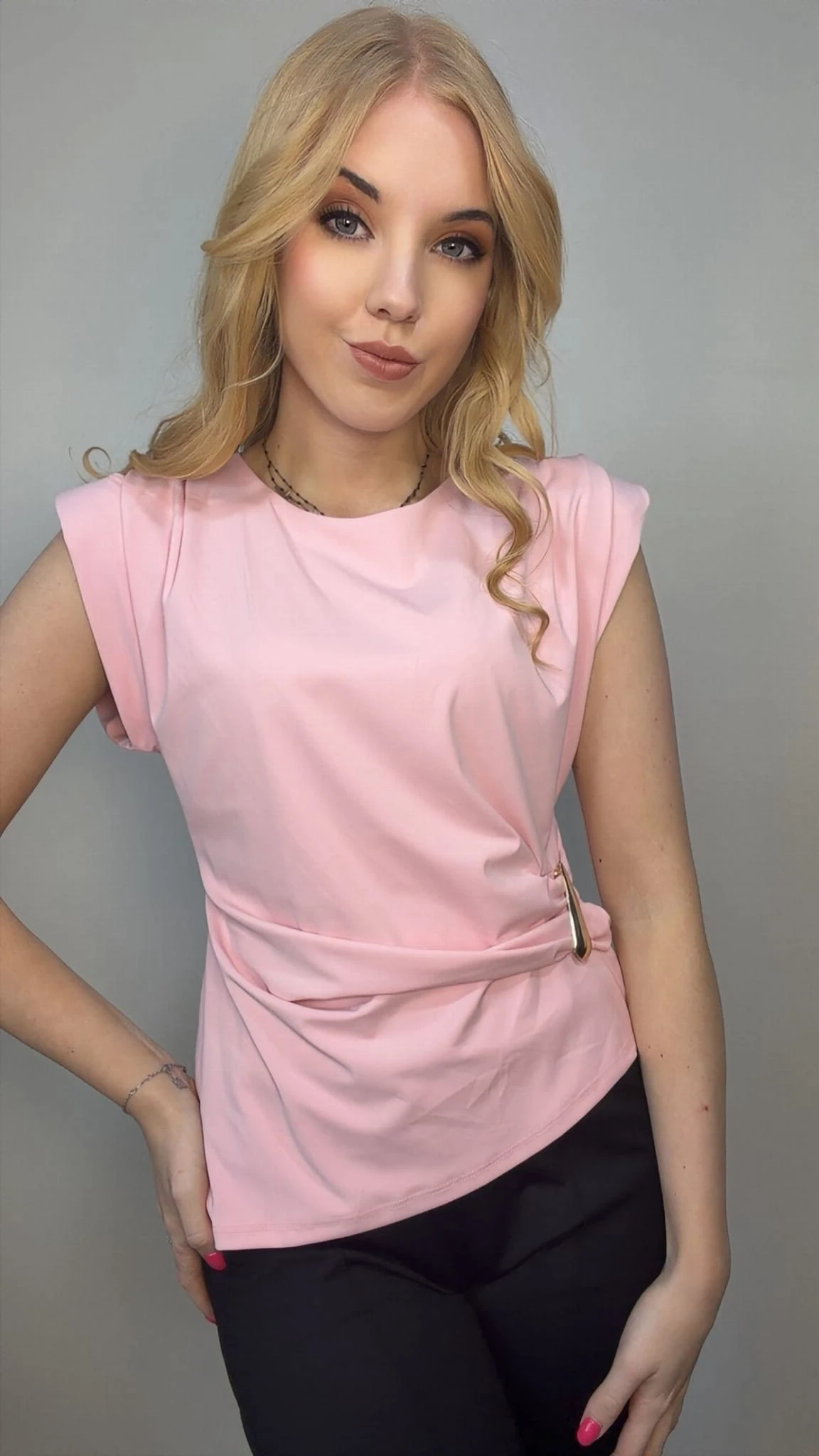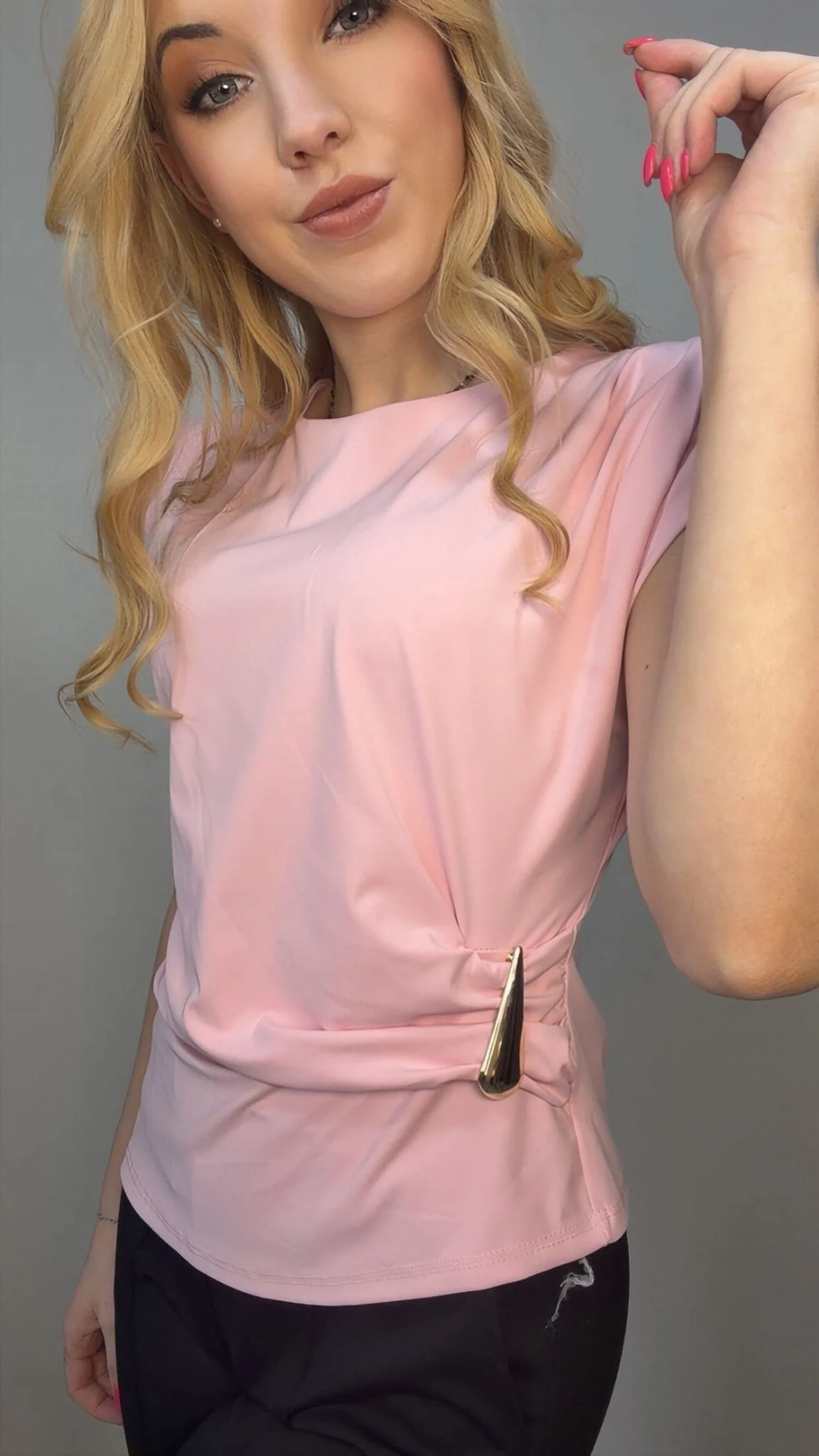Stylowa bluzka damska o dopasowanym kroju, która pięknie podkreśla sylwetkę i nadaje całości eleganckiego charakteru. Model wyróżnia się marszczeniem w talii oraz efektowną, ozdobną klamrą, która przyciąga uwagę i stanowi modny detal.