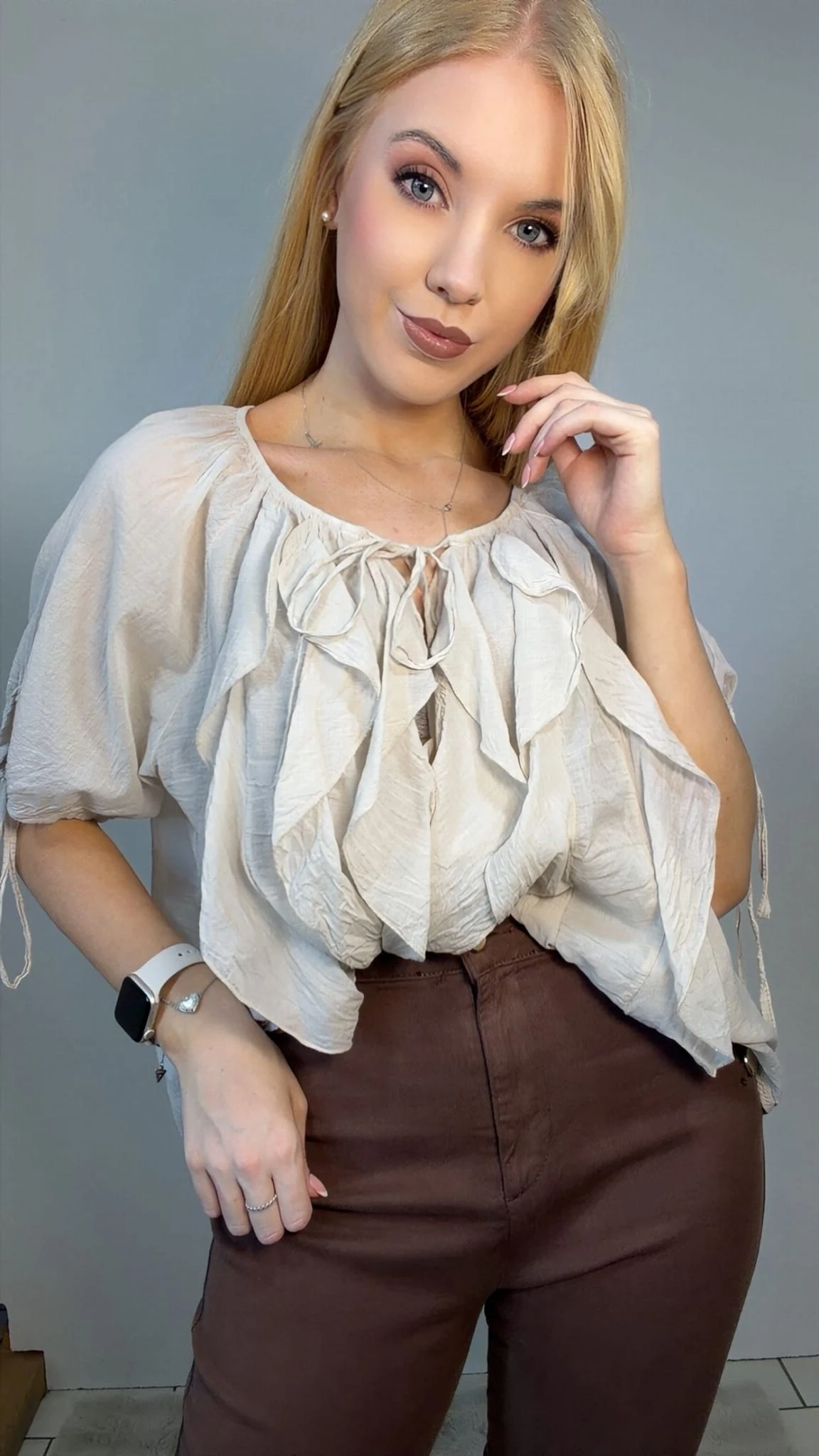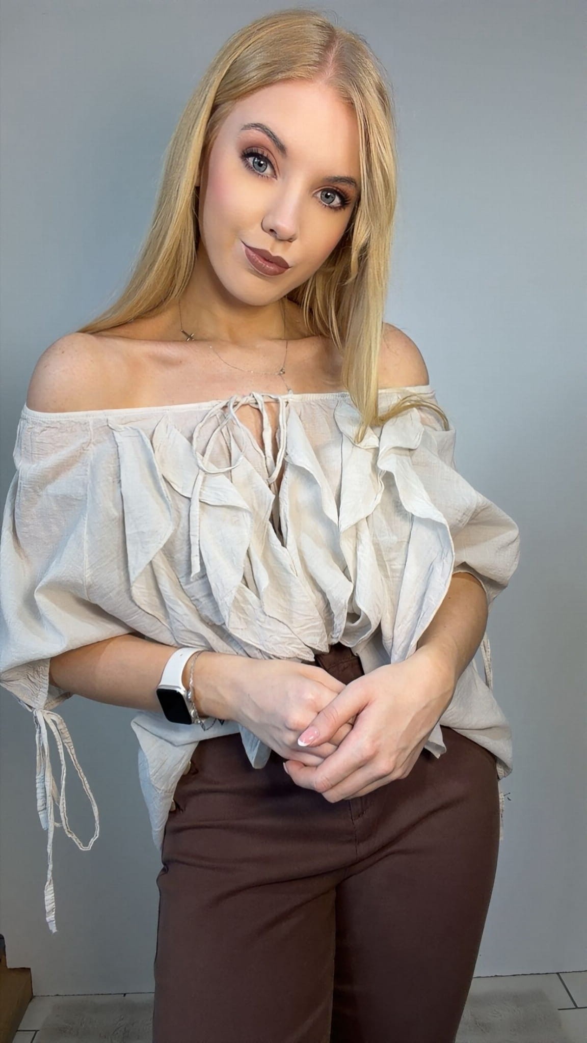 Bluzkę można nosić klasycznie lub opuścić na ramiona w stylu hiszpanki, co nadaje stylizacji wyjątkowego charakteru.