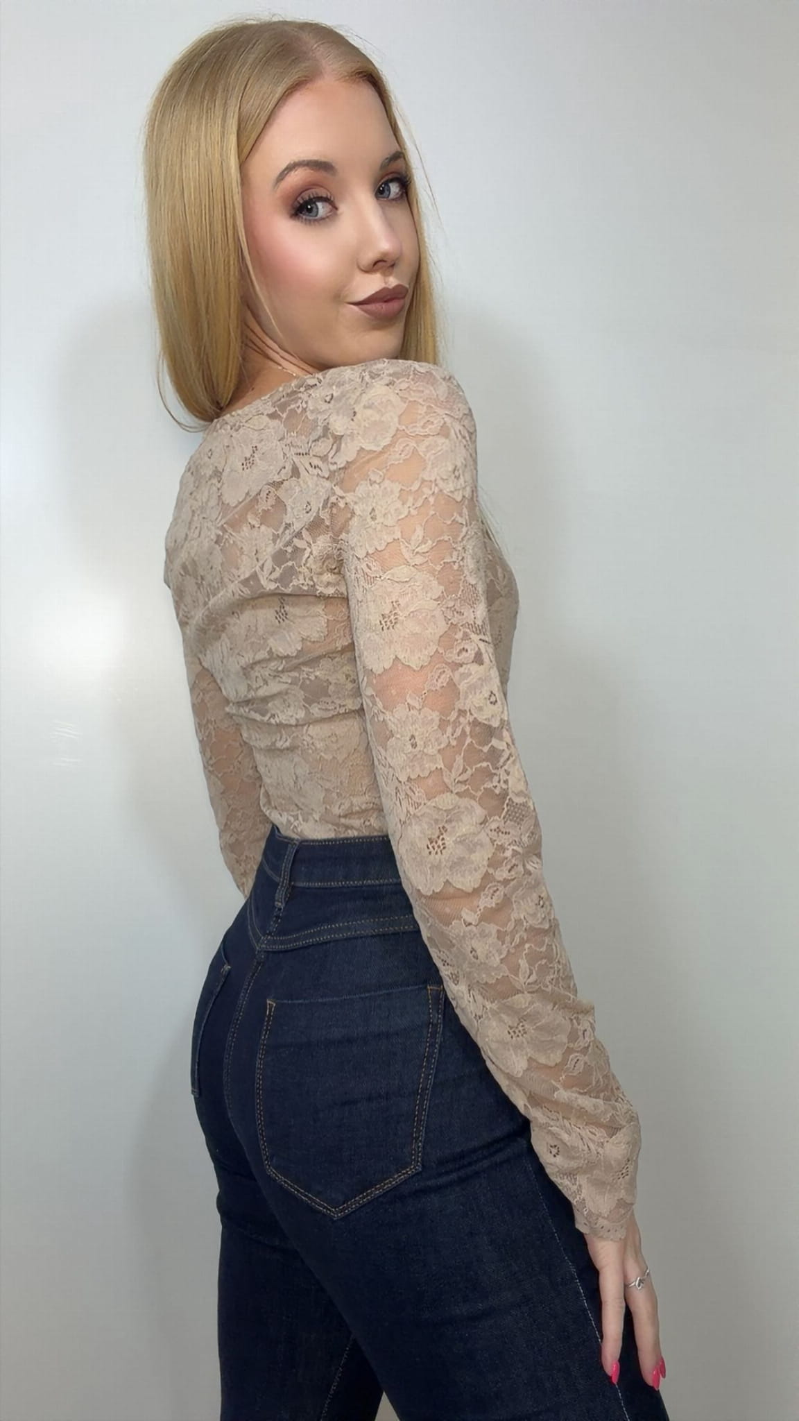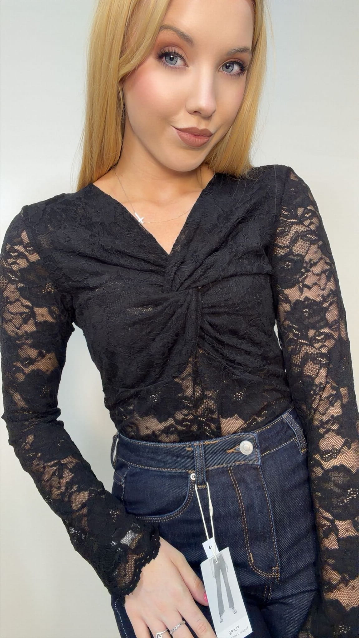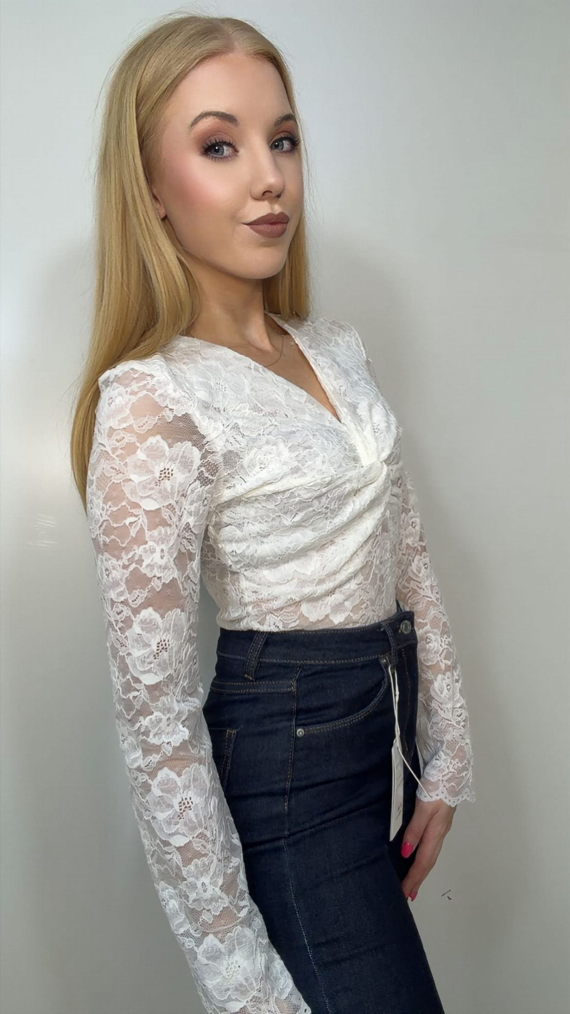 Bluzka posiada zabudowany dekolt z przodu, który zapewnia elegancki wygląd, natomiast pozostała część materiału jest lekko prześwitująca, co dodaje całości lekkości i wyjątkowego uroku. Ozdobne marszczenie z przodu podkreśla sylwetkę i nadaje bluzce modnego charakteru. Długie koronkowe rękawy dopełniają całość i sprawiają, że model wygląda bardzo stylowo.