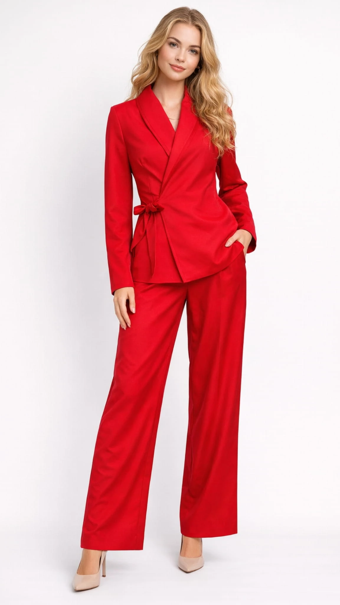 Stylowy i ponadczasowy garnitur damski w eleganckim wydaniu, który świetnie sprawdzi się zarówno na co dzień, jak i na specjalne okazje. Zestaw składa się z marynarki o kopertowym kroju oraz szerokich spodni, tworząc modny i wygodny komplet.