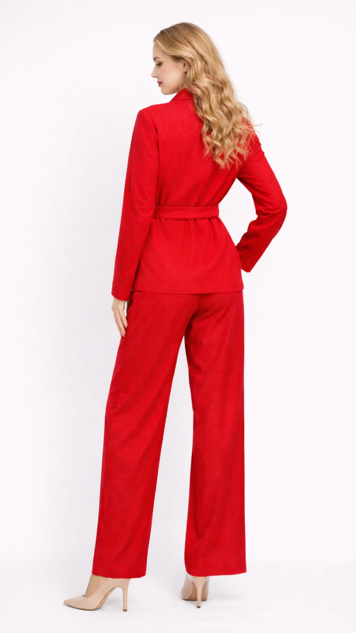 Marynarka wiązana w talii pięknie podkreśla sylwetkę, nadając jej kobiecego charakteru. Spodnie z elastyczną gumką zapewniają komfort noszenia i idealne dopasowanie do różnych typów sylwetek.