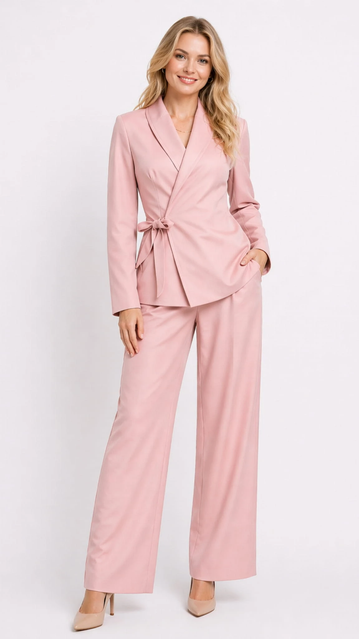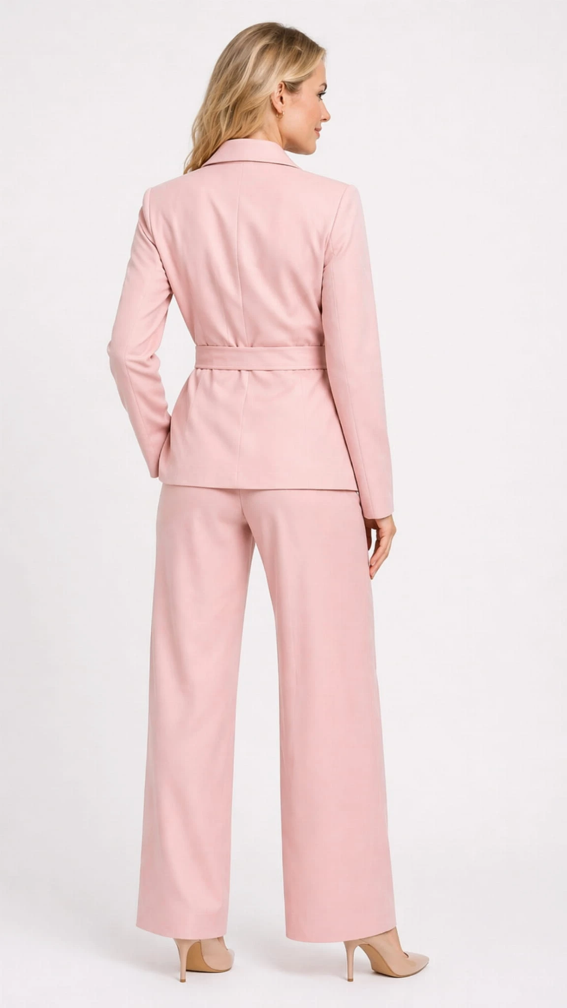 Marynarka wiązana w talii pięknie podkreśla sylwetkę, nadając jej kobiecego charakteru. Spodnie z elastyczną gumką zapewniają komfort noszenia i idealne dopasowanie do różnych typów sylwetek.