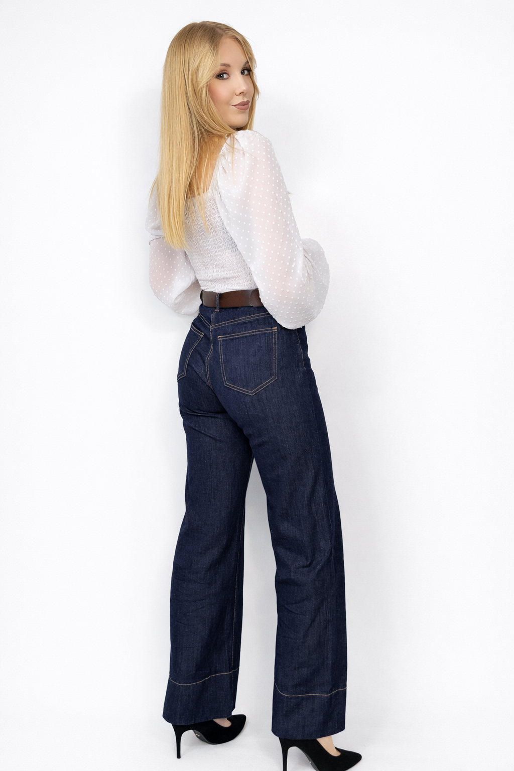 Model MOON GIRL to połączenie wysokiego stanu i luźnej nogawki wide leg, które pięknie modelują sylwetkę i optycznie wydłużają nogi.