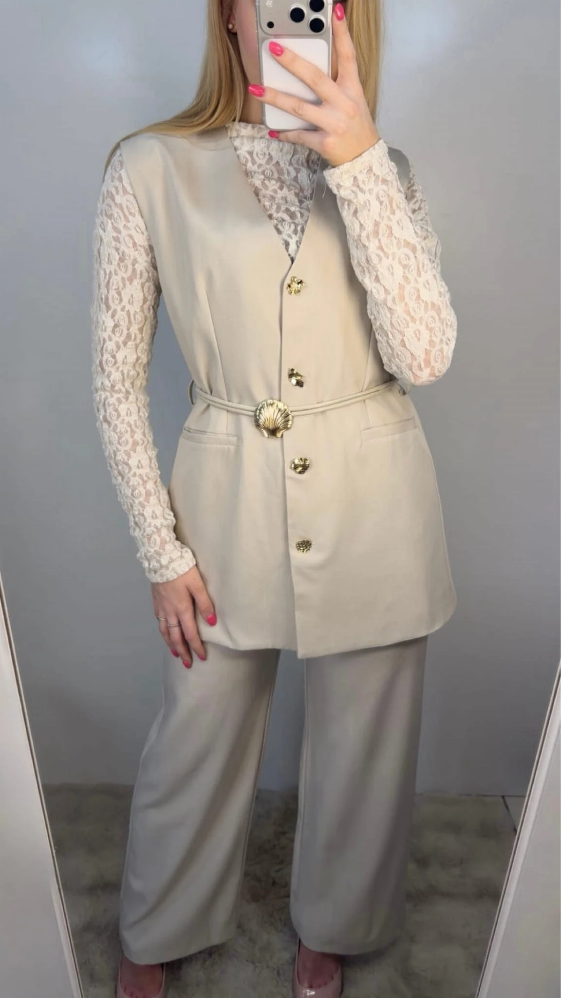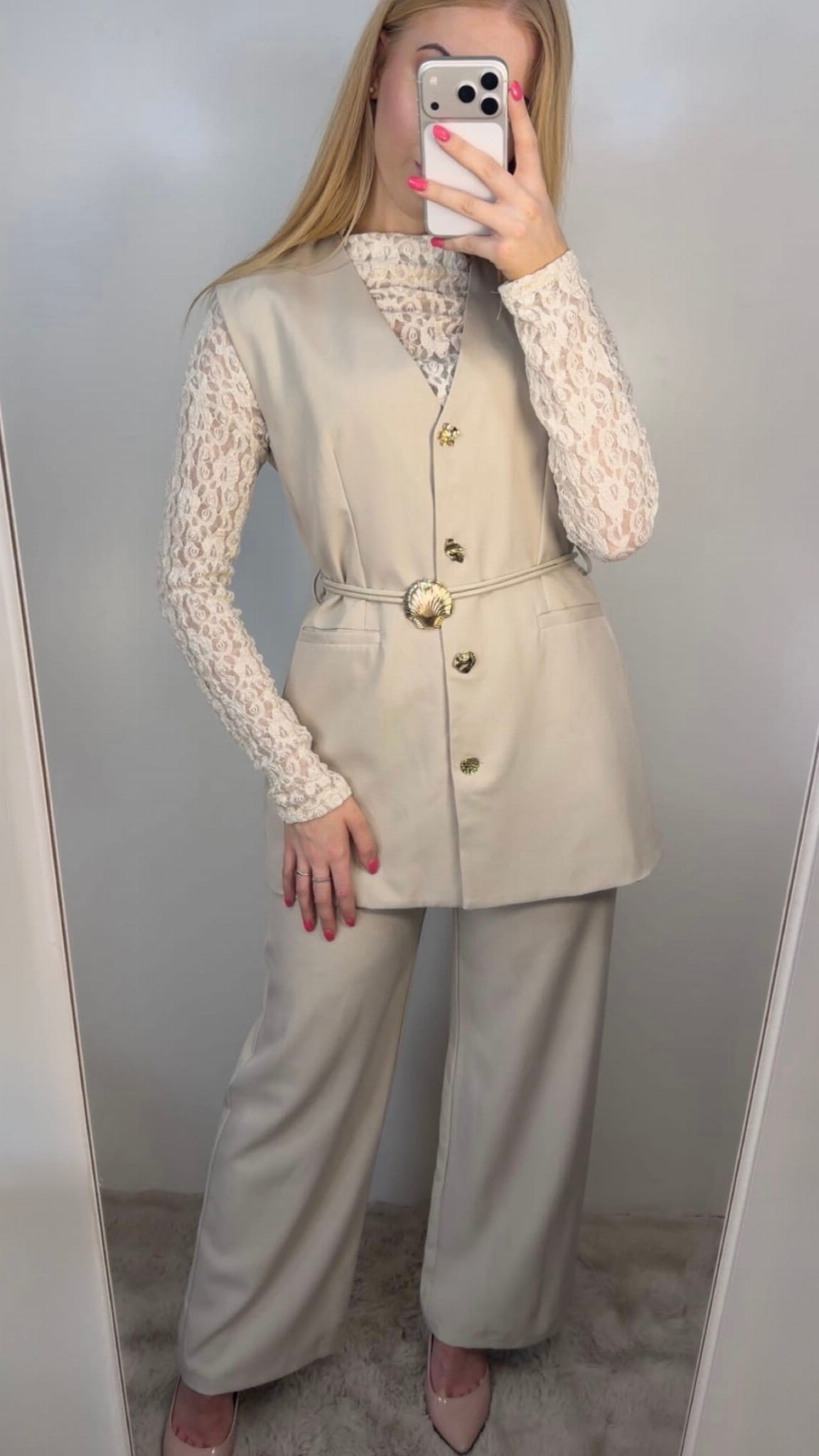 Elegancki i stylowy komplet damski, który łączy klasykę z nowoczesnym wykończeniem. W zestawie znajduje się kamizelka oraz spodnie, tworzące spójną i bardzo kobiecą stylizację – idealną zarówno na co dzień, jak i na bardziej formalne okazje.