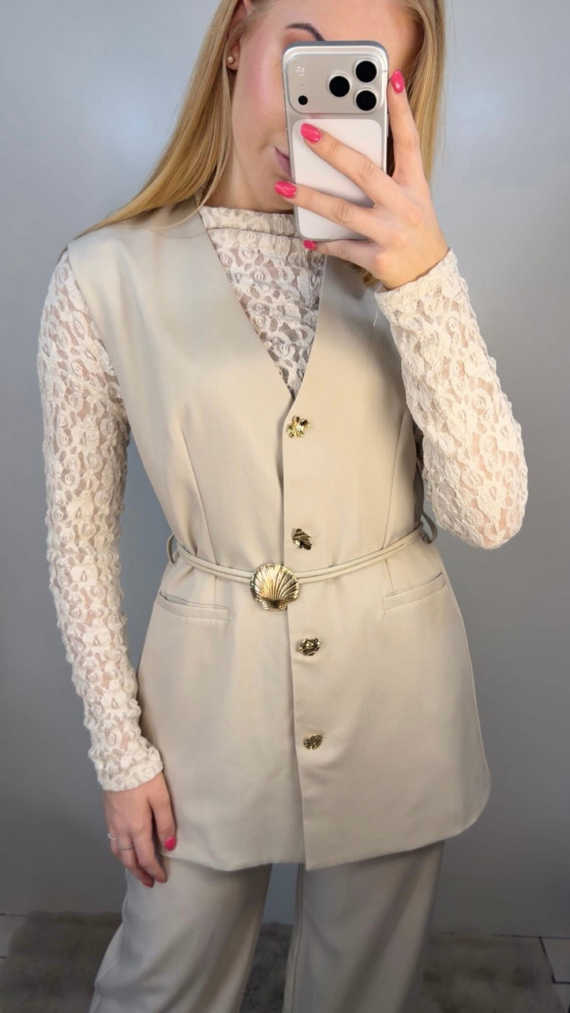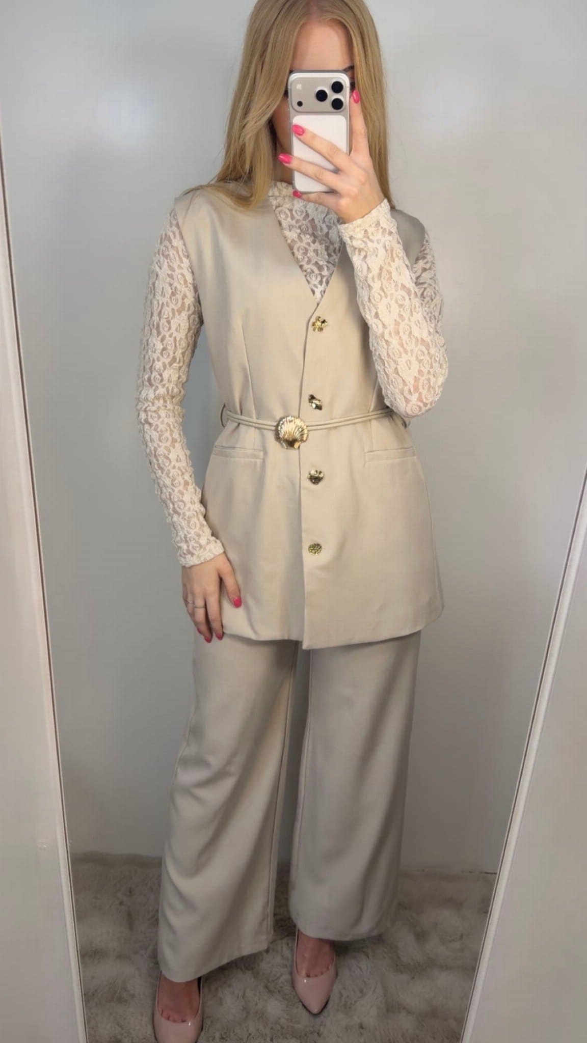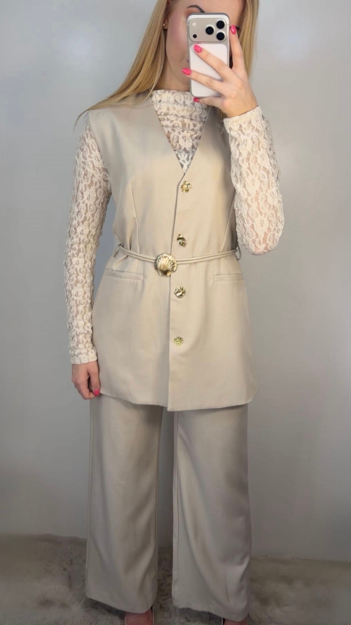 Kamizelka posiada ozdobne złote guziki oraz subtelne wiązanie w talii, które pięknie podkreśla sylwetkę i nadaje całości wyjątkowego charakteru. Spodnie mają wygodną gumkę w pasie oraz dodatkowe zapięcie na guzik, dzięki czemu świetnie dopasowują się do figury i zapewniają komfort noszenia.