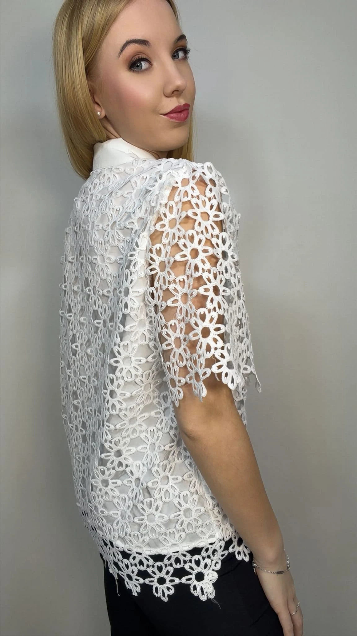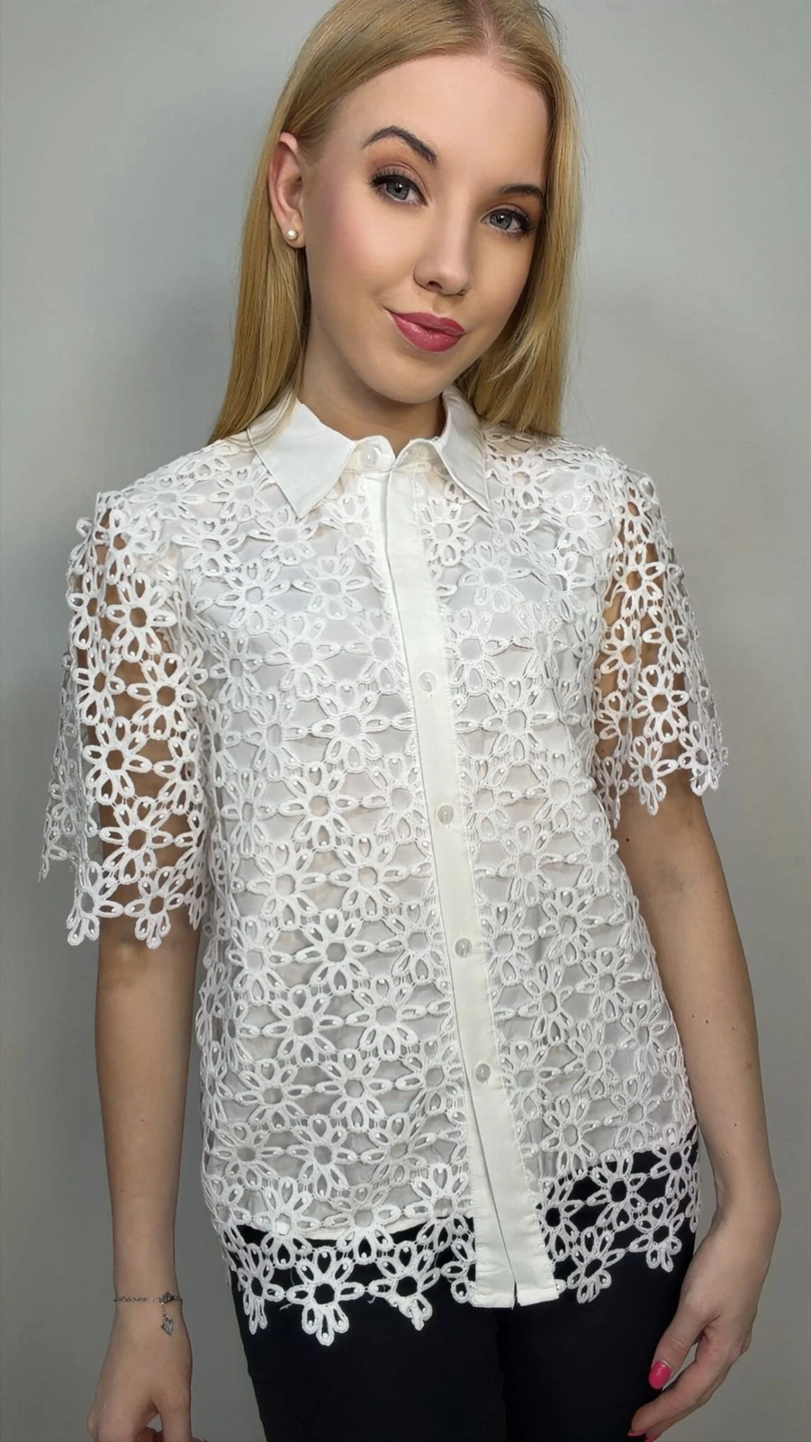 Elegancka i niezwykle kobieca bluzka koszulowa z ażurowej koronki w klasycznym białym kolorze. Delikatny, kwiatowy wzór nadaje jej lekkości i subtelnego uroku, a klasyczny kołnierzyk i zapięcie na guziki dodają całości szyku.