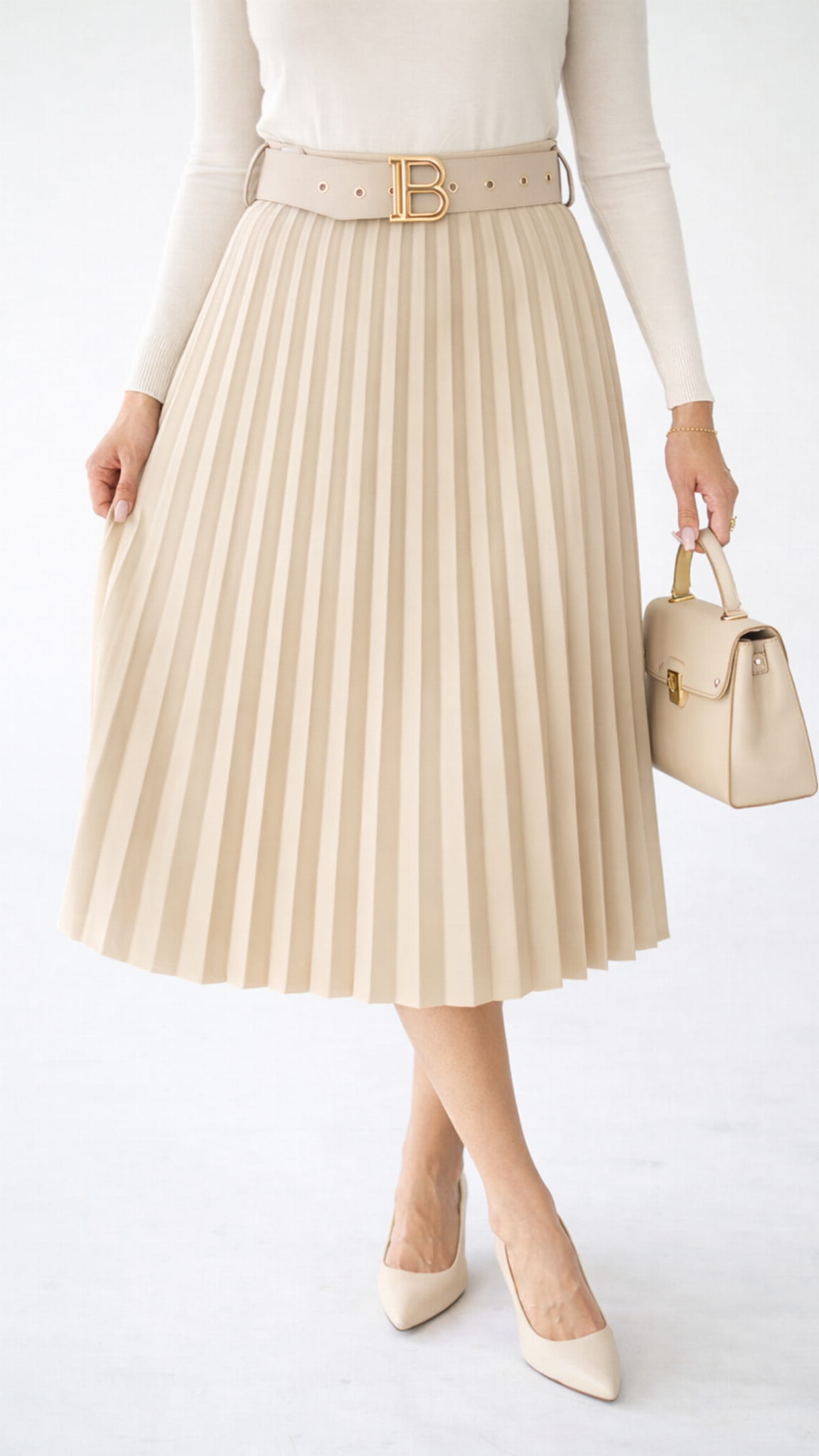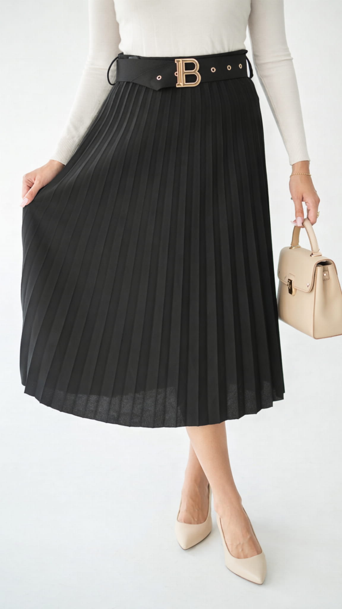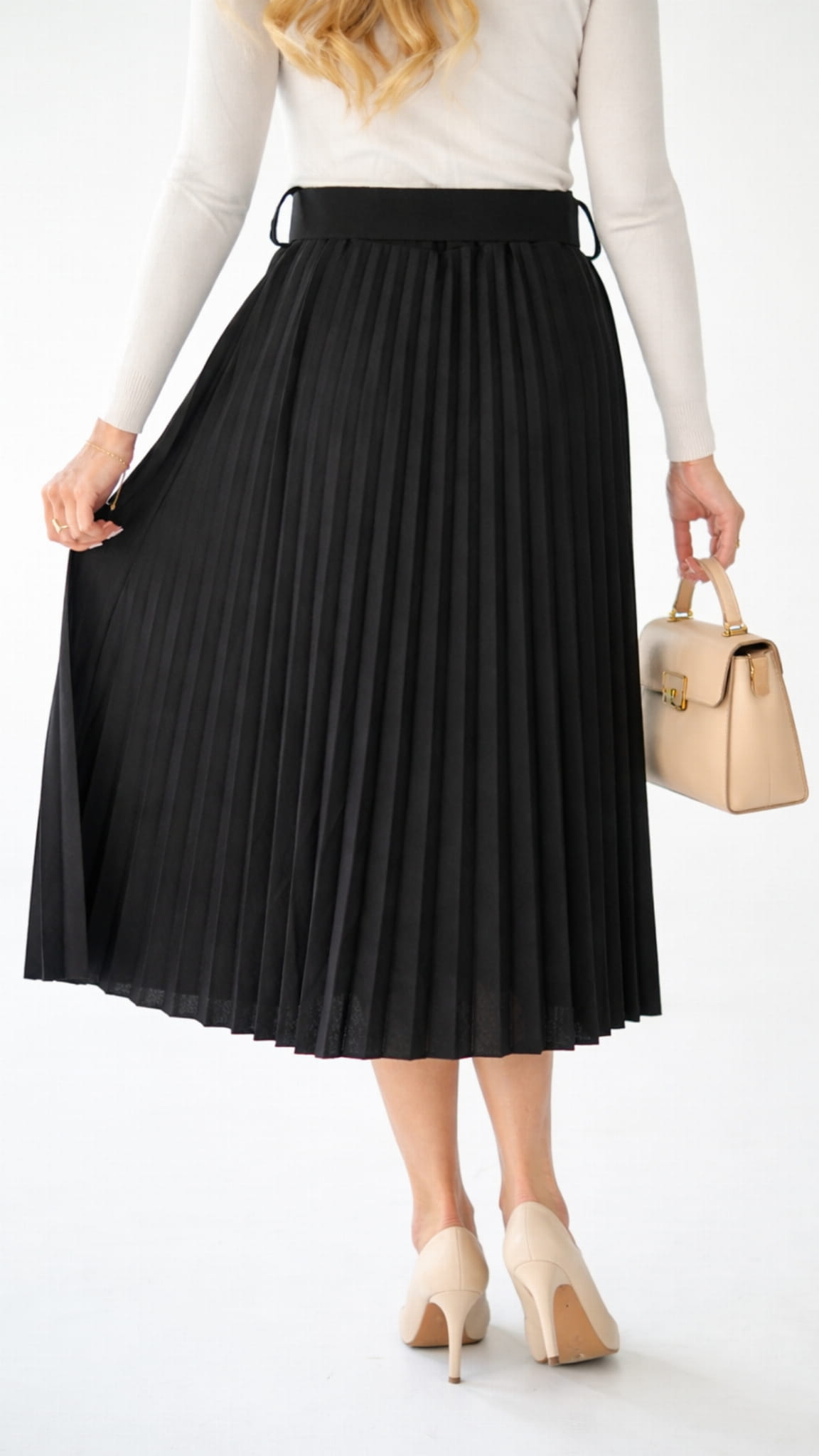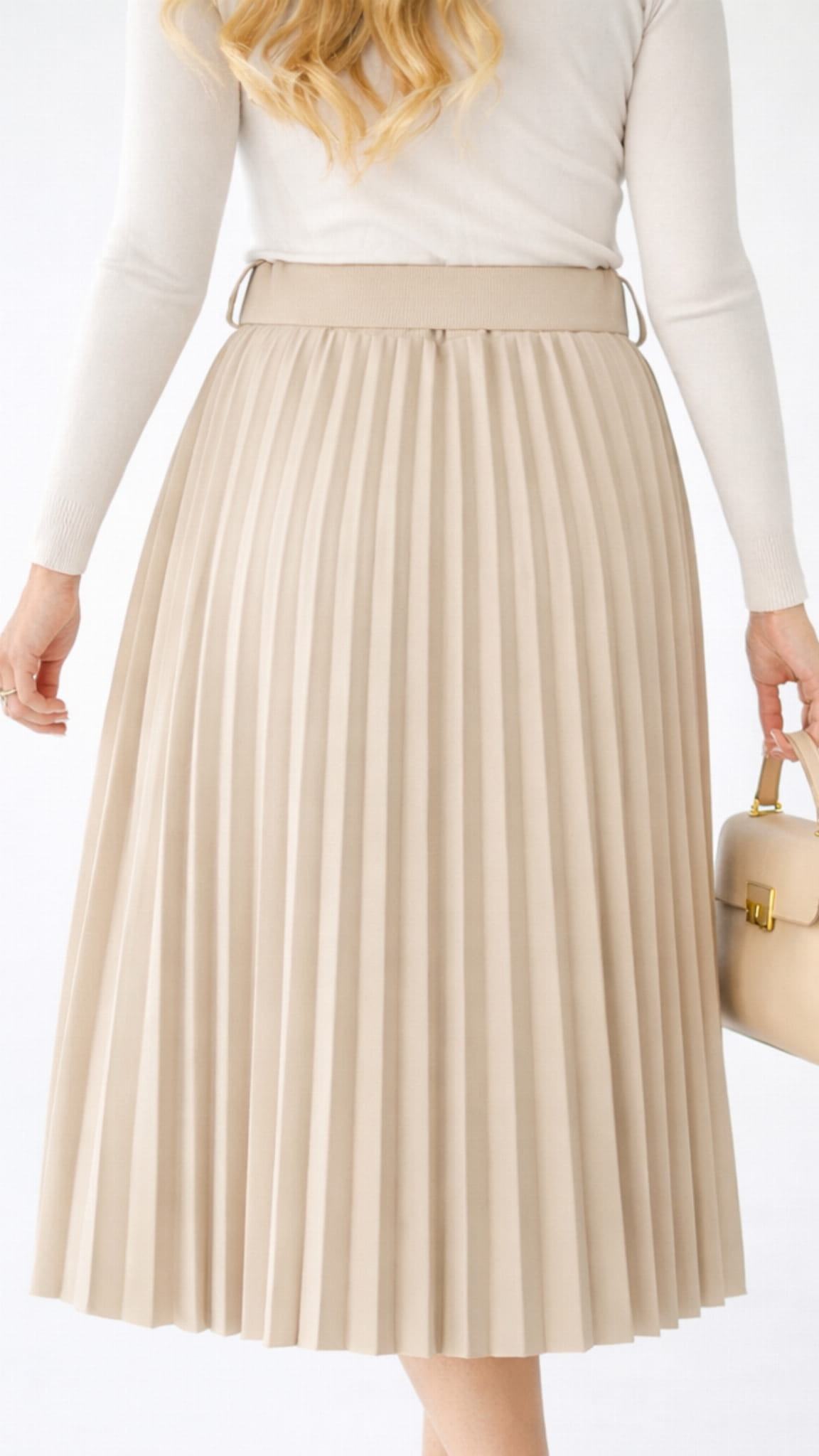 Klasyczna i ponadczasowa spódnica plisowana midi, która doskonale sprawdzi się w eleganckich i codziennych stylizacjach. Delikatne plisy nadają jej lekkości i sprawiają, że pięknie układa się w ruchu, podkreślając kobiecy charakter stylizacji.